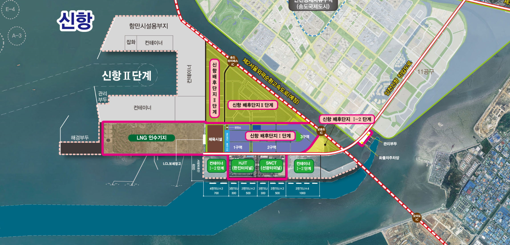 제 2차 신항만건설기본계획 고시('19.8)에 따라서 서기 2040년까지 약 6,700㎡ 규모의 항만을 개발해서 산업지원의 거점항만으로 키울 것을 목표로 개발하고 있다고 합니다. 5만톤급들의 대형선들이 들어오고 나갈수 있도록 신규로 항로준설로 할 계획이라고 합니다. 또한 북항 배후단지내에 국내 최대 규모의 중고자동차 유통단지가 들어설 예정이라고 합니다. 인천 오토렉스라는 회사이며, 2022년 완공 예정이라고 합니다.