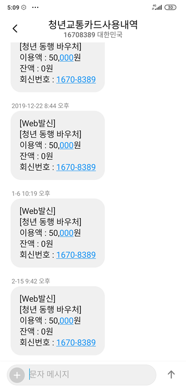해당 사이트로 접속하시면 더욱 자세한 내용을 알 수 있습니다. 저같은 경우는 청년동행카드가 아니라 청년교통카드라고 저장을 아예 해 놓았습니다. 쓸 때마다 아래 이미지처럼 50,000의 바우처에서 50,000이 사용되여 잔액이 0원이 남았다고 항상 문자가 옵니다. 한번도 안빼먹고 쓰고 있습니다.