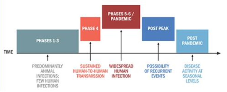 WHO의 전염병 단계는 1999년에 정립되어 2005에 개정되었습니다. '단계'들은 전세계에 적용을 할 수 있으며, 또한 국가들의 전염병에 대한 대응 대첵과 대비를 수립할 수 있도록 국제적인 프레임워크(틀)을 제공하게 합니다. 2005년 개정판에서는 이러한 대응 계획과 접근방식 그리고 새롭게 권장되는 사항에 대해 통합하여 6가지 단계로 정립을 하였습니다.