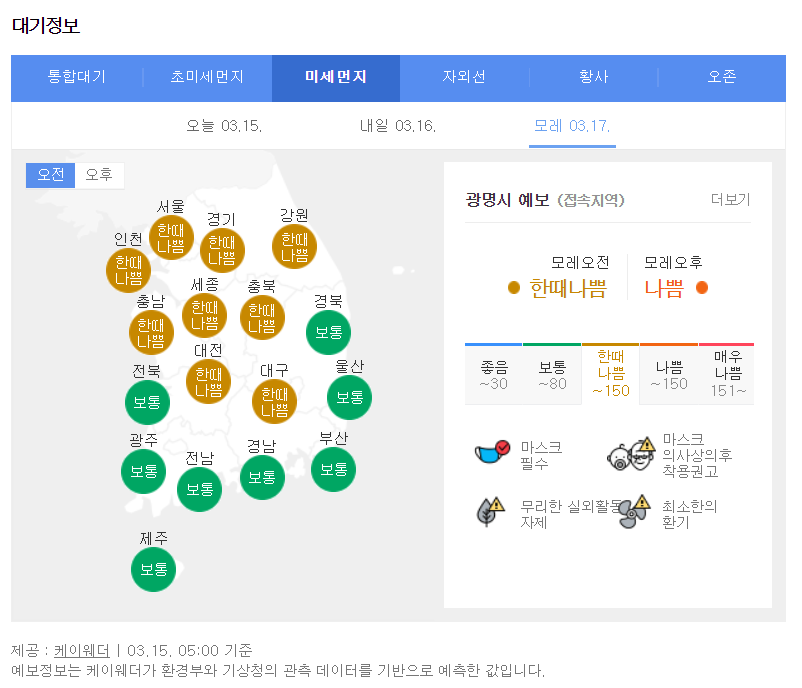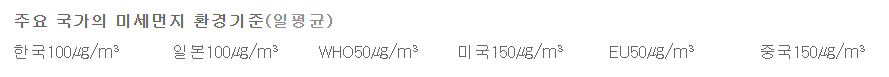 미세먼지의 기준은 국가별로 다르며 우리나라 기준으로는 30이하는 좋고, 80이하면 보통이며, 150이하면 나쁘고 그 이상이면 매우 나쁘다라고 나오는데 현재는PM-10과 PM-2.5에 대한 대기환경기준만 운영 중이라고 합니다. 또한 8개 항목, SO2 이산화황, CO 일산화탄소, NO2 이산화질소, PM10, PM2.5, O3 오존 , 납, 벤젠을 대상으로 하고있습니다.