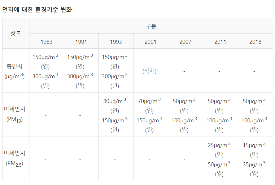 총부유분진(Total Suspended Particles)이 먼지에 대한 환경기준이었습니다. (1983년) 50㎛이하의 부유 미세먼지를 말한다고 합니다. 그리고, 1993년 10㎛에 대한 기준이 추가되었으며, 2011년에는 2.5㎛에 대한 기준이 추가 되었습니다.