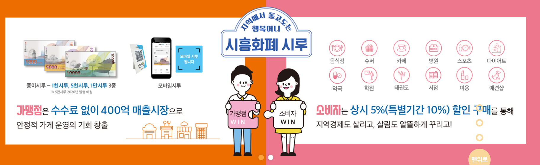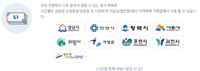 시루화폐 이름 귀엽게 잘 지은 것 같습니다. 위 시흥화폐 '시루'처럼 지류형으로 시와 군별로 구입할 수 있는 상품권을 서비스 중인 시 군은 아래와 같습니다.