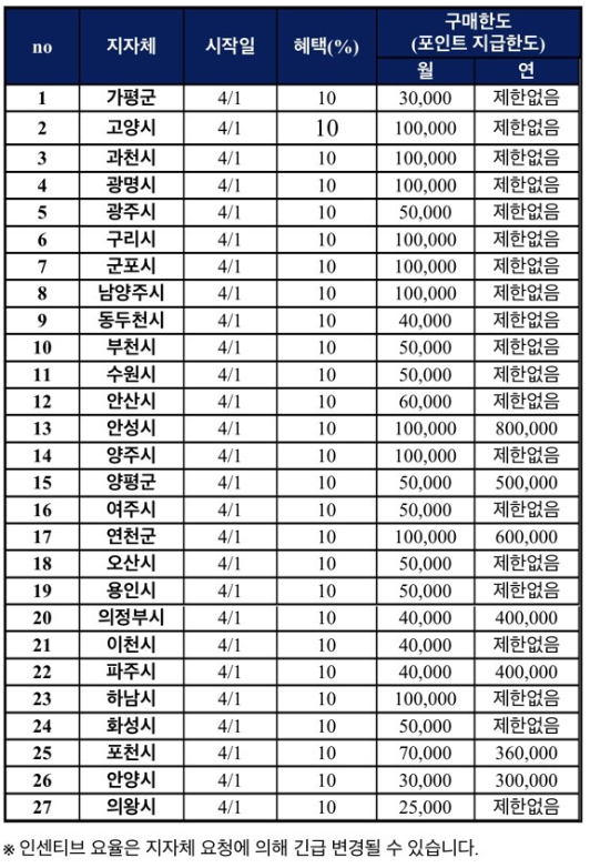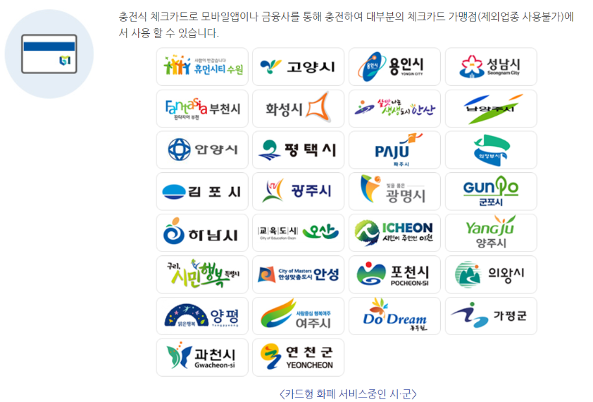 가평사랑상품권, 고양페이카드, 과천화폐 과천토리, 광명사랑화폐, 광주사랑카드, 구리사랑카드, 군포愛머니, Thank you Pay_N(남양주시), 동두천사랑카드, 부천페이, 수원페이, 안산사랑상품권 다온, 안성사랑카드, 안양사랑페이, 양주사랑카드, 양평통보, 여주사랑카드, 연천사랑상품권, 오산화폐 오색전, 용인와이페이, 의왕사랑상품권, 의정부사랑카드, 이천사랑지역화폐, 파주페이, 포천사랑상품권, 하남하머니, 행복화성지역화폐, 행복화성지역화폐_화이트
