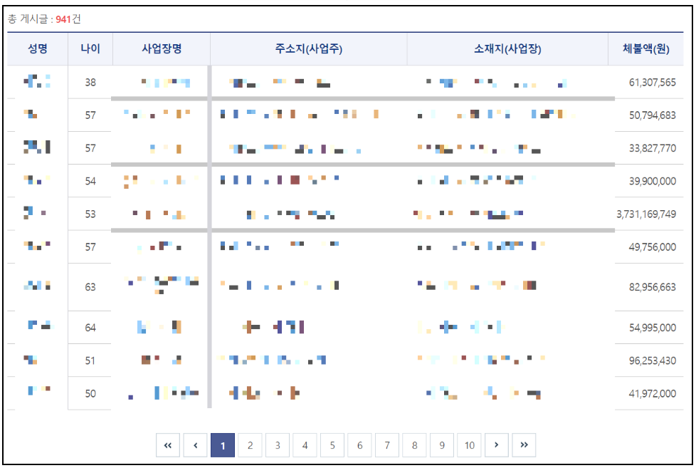 검색결과에는 임금체불사업주의 이름, 사업장명, 임금체불사업주의 주소와 사업장 주소 그리고 체불액까지 생각이상으로 자세하게 나옵니다.