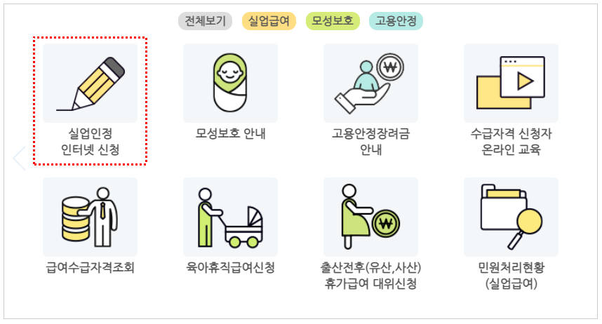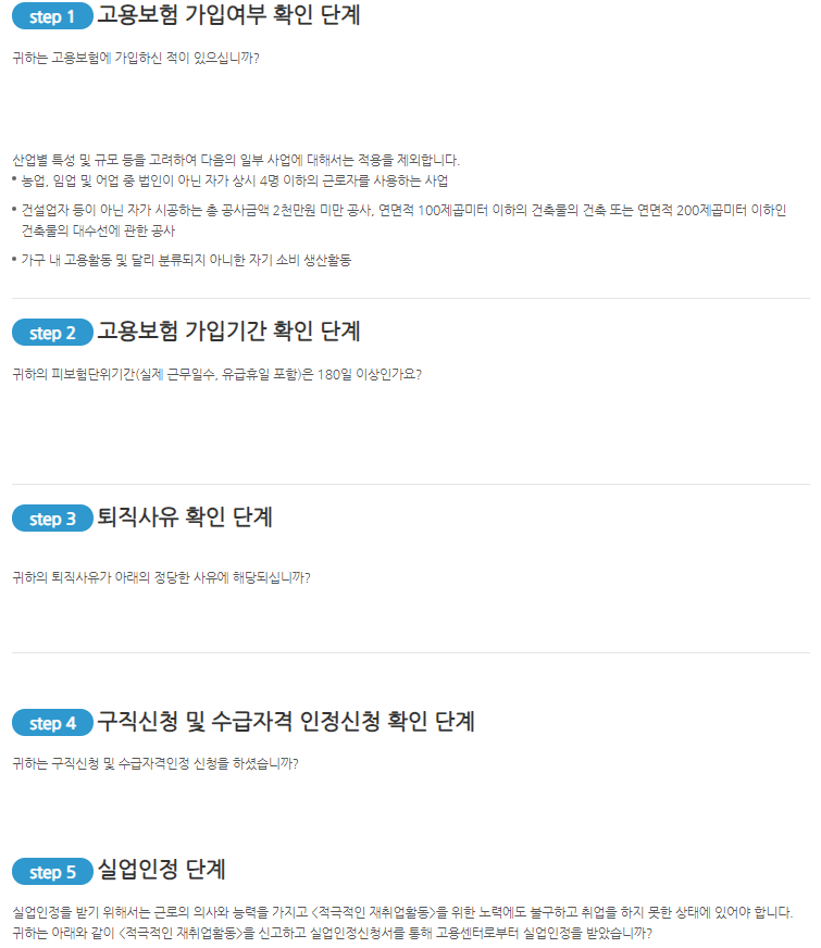실업급여 수급자격요건을 신청하기 전에 미리 판단하기 위해 실업인정을 받을 수 있는지 모의 테스트를 할 수 있습니다.