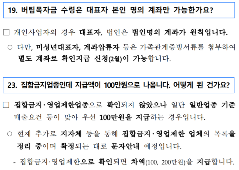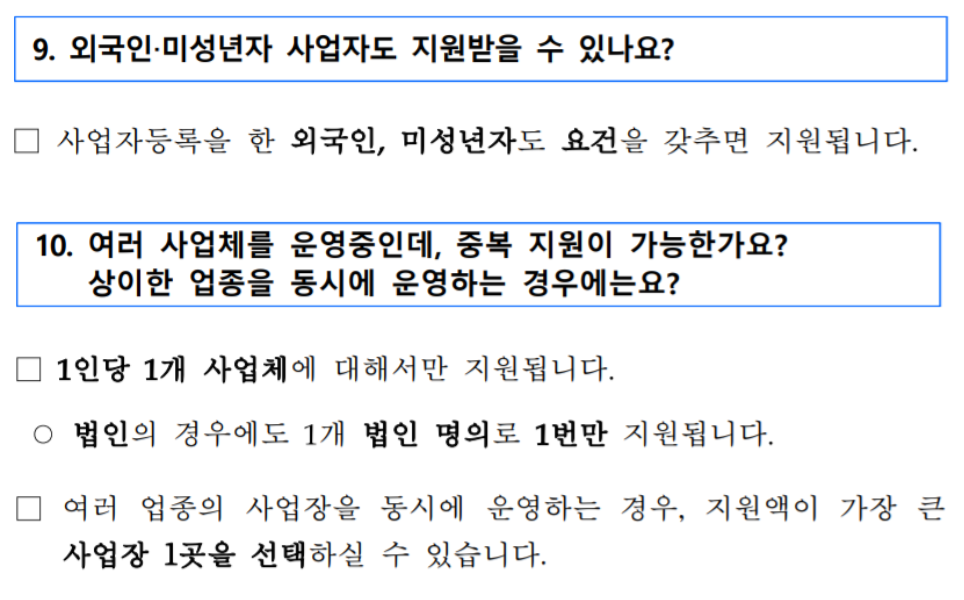 1인당 1개의 사업체에 대하여만 지원이 됩니다. 법인의 경우라면 1개의 법인 명의로 되어있는 본점 그리고 직영점 중 택1하여 신청이 가능하며, 만약 여러업종 및 사업장을 동시 운영하는 경우라면 지원액이 큰 사업장 한 곳만을 선택하여 진행할 수가 있습니다.