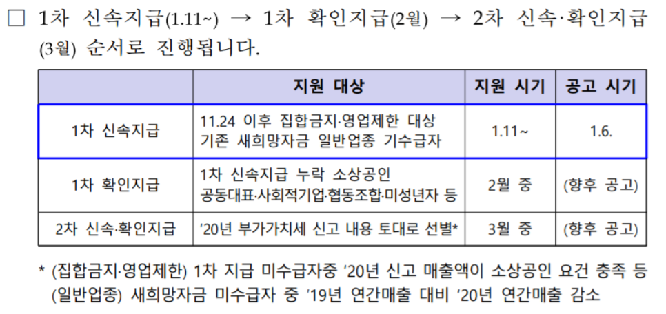 한편, 지난해 11월 30일 이전에 개업을 한 기준이며 신청일 기준으로 실제 영업 중인 사업장만 해당이 됩니다. 만일 매출감소로 새희망자금을 기지급 받았던 일반업종들의 소사공인이 우선지원됩니다.